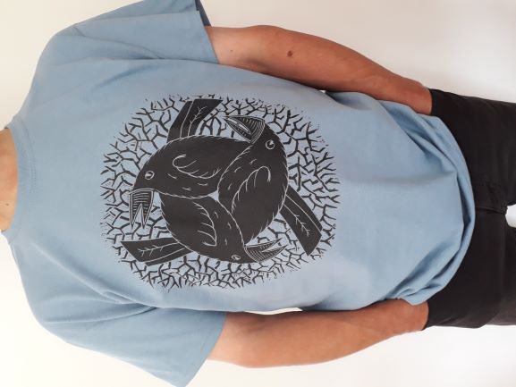 The shirts are 100% cotton and are available in a variety of sizes and colours. The designs are in black and are derived from some of my original linocut prints.